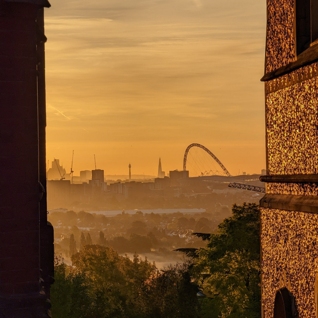 Pratik Goyal for ‘Lion in the den’ – view of Wembley Stadium taken through buildings on Harrow on the Hill