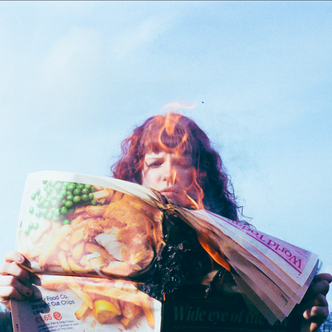 Niall Sewell (Student at Nower Hill High School) for ‘The death of print’ – a portrait of a person holding a flaming newspaper, commenting on young people’s relationship with print.