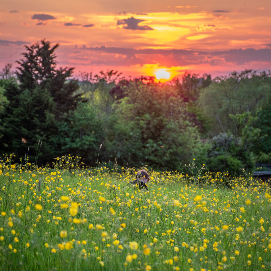 Bill Chalmers for ‘Lazy Days’ – a figure reading in a field of buttercups on Pinner Park Farm